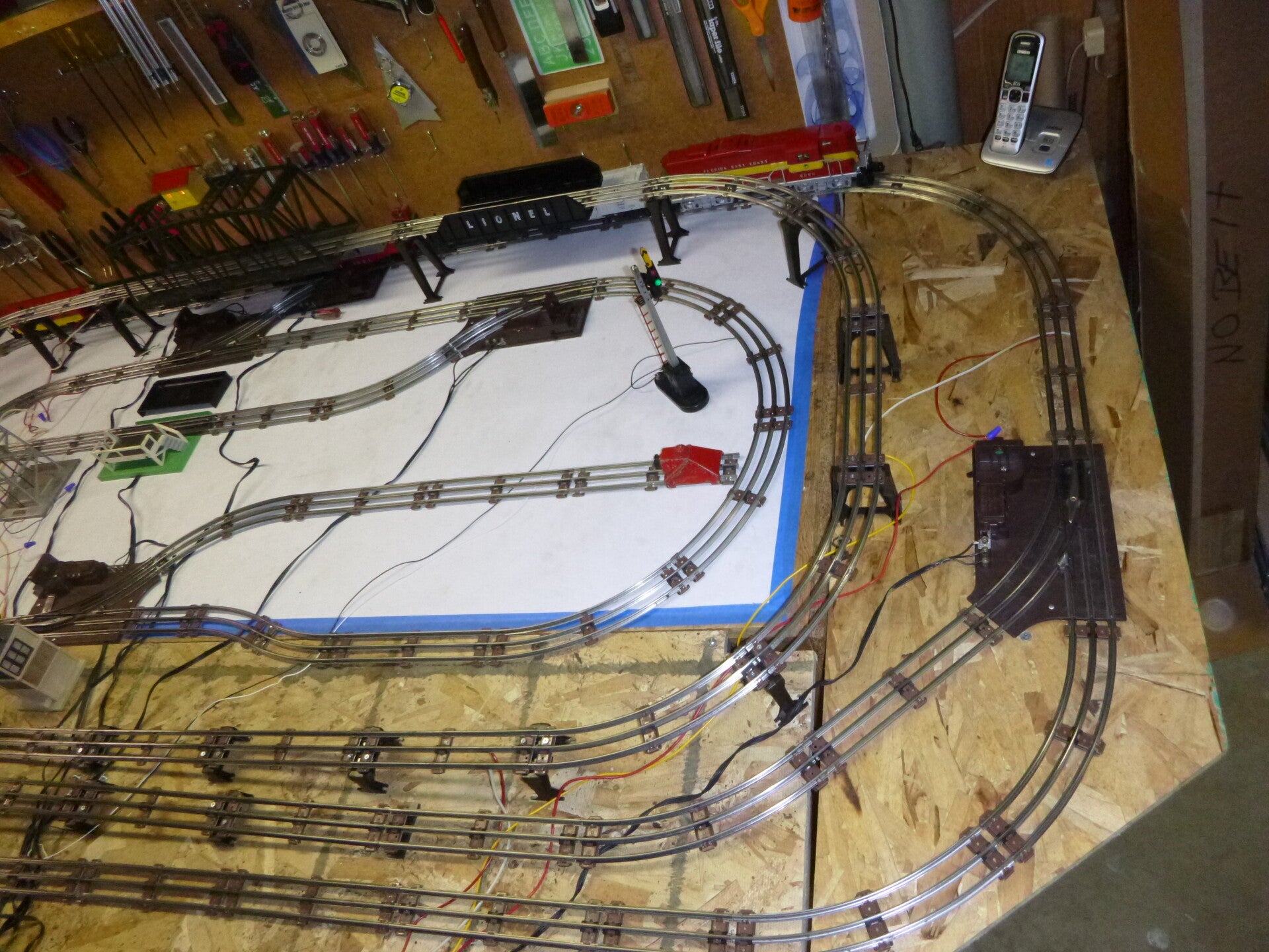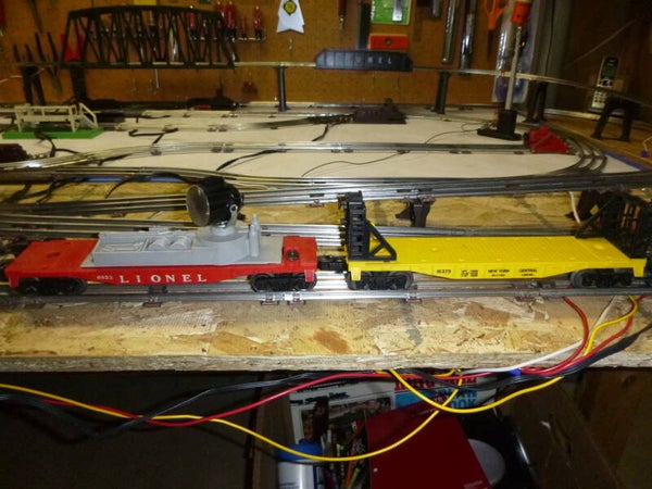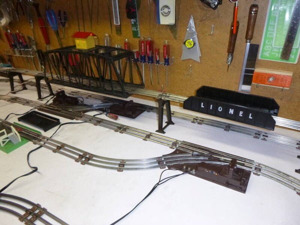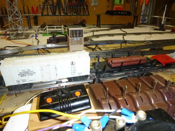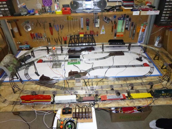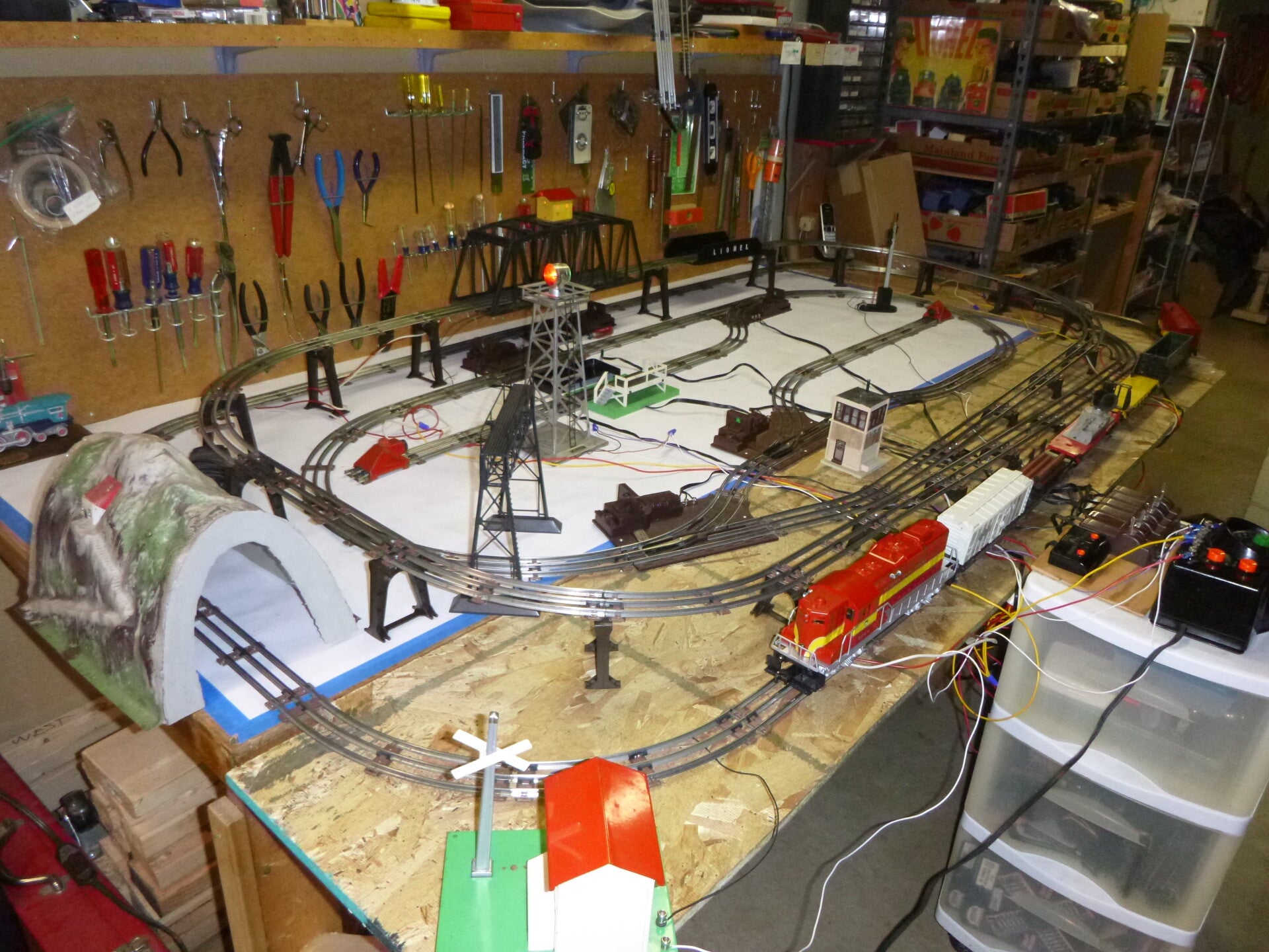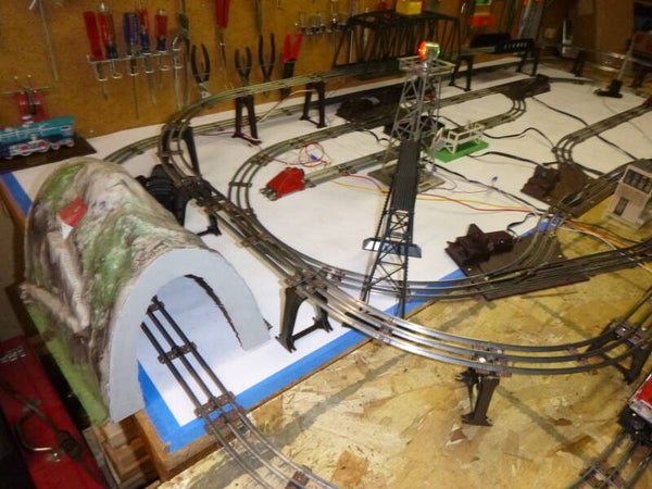 Everything in this set has been reconditioned, tested, and works good. The engine has been serviced, the cars and illuminated caboose are all in good condition, the operating semaphore and automatic gateman work perfect. The long bridge is illuminated. Tracks are 027, and I adapted the layout from original Lionel showroom specs that used Super O track which has 36" curves. I made the same layout fit 4x8 using 027 tracks. Set includes an operating milk car with pen, operating log dump car with bin, 6 remote switches, a Lionel operating beacon tower, tunnel, signal bridge, and switch tower. A full trestle set with clips, operating searchlight car, 78 tracks all polished on top, pair illuminated Lionel red cap bumpers, a Lionel 125w LW type transformer. I used special trigger tracks for the Gateman and Semaphore for best operating results. You'll need to add wire to the tracks and accessories to go underneath your board of choice. Board size is 4x8.