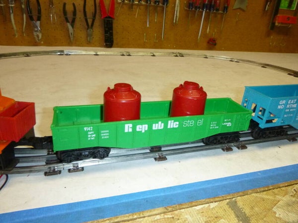 Engine has been serviced and runs perfect. It has an electronic 3 position E unit which reverses the direction by using the throttle lever instead of the transformer direction button. Cars are all in good condition. Transformer works great. Tracks have all been cleaned and are ready to assemble. More track can be added if desired. Use 027 tracks when expanding.