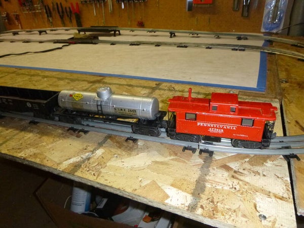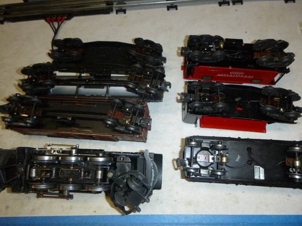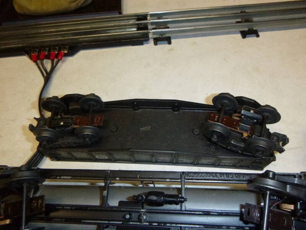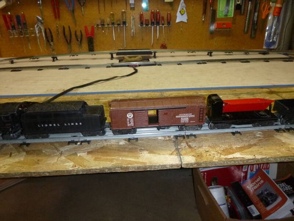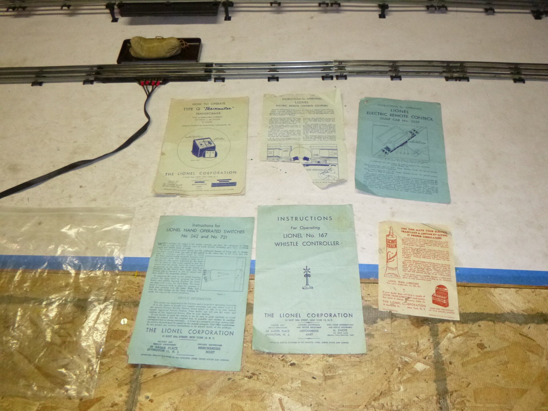 First set Lionel produced after wars end in Dec. 1945. Back to making model trains. Runs perfect. Whistle tender works great. Type Q transformer works great. This was the correct transformer sold along with the set. The set includes; 2-6-2 loco #224, whistle tender #2466W, double door box car #2458, gondola #2452, tanker #2555, and lighted caboose #2457. Caboose lights up perfect. All cars have the flying shoe trucks, and all couplers work. An add on is ore dump car #3559, also having flying shoes. Tracks are O gauge and have all been polished. The manual switches are 042's and have good lanterns and bulbs. Paperwork is included along with a 6 piece trestle set and bridge. Correct lock on with wires included. The remote operating track works great.